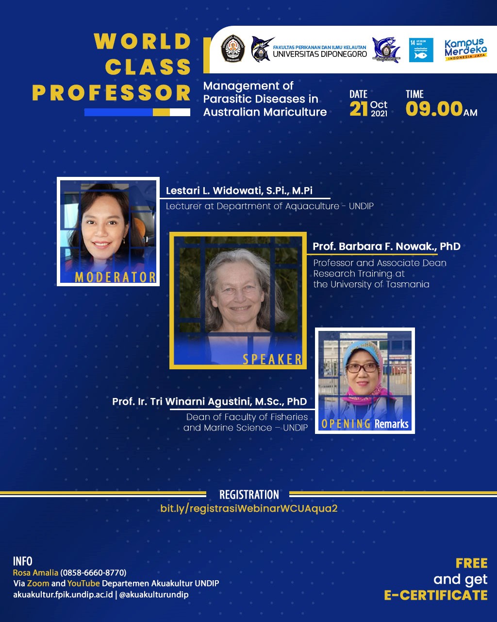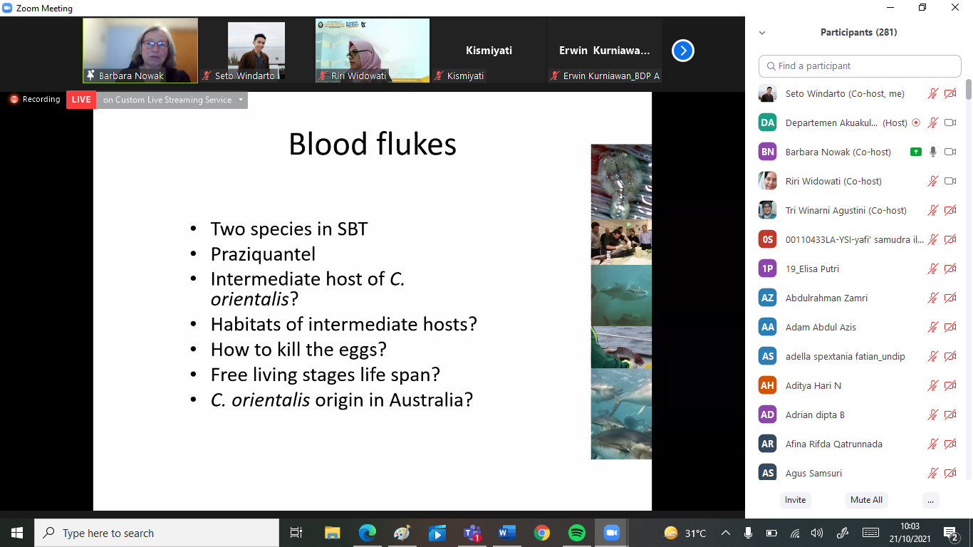 Semarang – Dalam rangka kegiatan World Class Professor 2021, Departemen Budidaya Perairan Fakultas Perikanan dan Ilmu Kelautan Universitas Diponegoro (FPIK UNDIP) menyelenggarakan seminar daring dengan tema: “Penanganan Penyakit Parasit pada Marikultur Australia.” Pembicara pada acara ini adalah Prof. Barbara F. Nowak., Ph.D., Guru Besar dan Associate Dean Research Training di University of Tasmania dan dimoderatori oleh Dr. Lestari L. Widowati, S.Pi., M.Pi, Dosen Akuakultur – UNDIP. Acara ini diawali dengan sambutan oleh Dekan Fakultas Perikanan dan Ilmu Kelautan, Universitas Diponegoro.