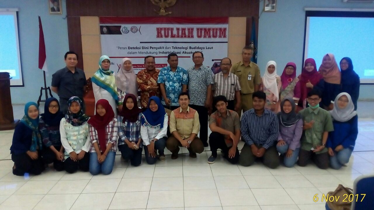 On Monday, November 6, 2017 at the FPIK Tembalang Auditorium, a public lecture was held by the Department of Aquaculture. The public lecture was attended by students, lecturers, official staff and other parties, with 2 (two) speakers, namely: Dr.Ir. Woro Nur Endang Sariati, MP (Head of Class I Denpasar Bali KIPM Center) and Mulyanto, ST, M.Si. (Head of Perikan Hall