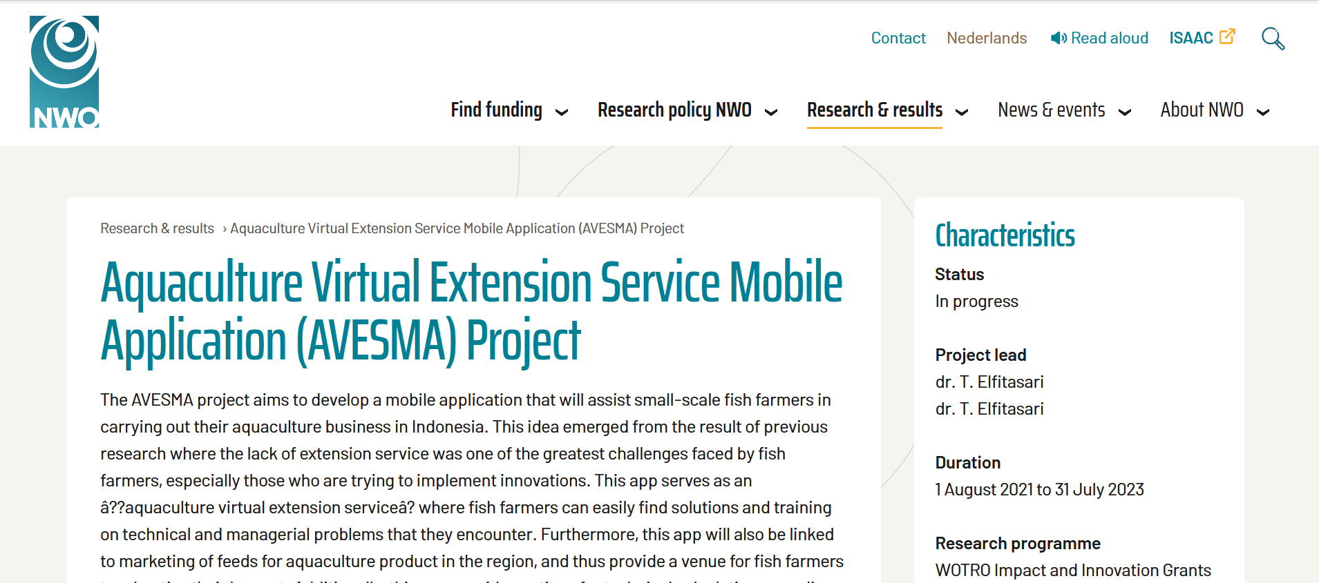 Aquaculture, Semarang – One of the lecturers in the Aquaculture Study Program, Dr. Tita Elfitasari, recently received a grant from NWO WOTRO Netherlands for the Impact and Innovation Grants (I & IG) scheme. The grant project that will be implemented is entitled “Aquaculture Virtual Extension Service Mobile Application (AVESMA)”. This project is a follow-up project to the Project for Aquaculture to Support Mangrove Restoration in Indonesia (PASMI) which at that time was chaired by Prof. Ir. Dr. Sri Rejeki, MSc. and project members were Dr. Tita Elfitasari, SPi., MSc.; Dr. Lestari Lakhsmi W, SPi., MSi. and Restiana Wisnu A, SPi., MSi. One of the results of the PASMI project research conducted by Dr. Tita Elfitasari using the Rapid Appraisal for Aquaculture Innovation System (RAAIS) method indicated that the insufficient number of extension services had an impact on the effectiveness and efficiency of field extension service’s work. Based on these results, the idea was to create the AVESMA application as a virtual extension service for aquaculture.