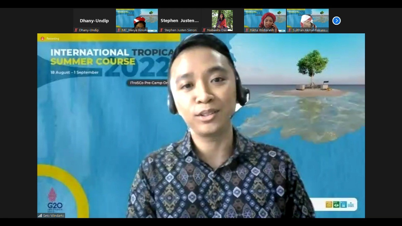 The Opening Ceremony of the International Tropical Summer Course (ITroSCo) 2022 will be held on Thursday, August 18, 2022, at 17.00 WIB online through the Zoom meeting platform. Vice-Rector IV attended the ItroSCo 2022 Opening Ceremony, with the Dean of FPIK and his staff, the Head of the Undip Ranking Office, and the participants of ITroSCo 2022. The Dean of FPIK Undip, Prof. Ir. Tri Winarni Agustini, MSc., Ph.D., welcomed the ItroSCo 2022 participants in her speech. “I am happy that even though we are currently in a tough situation due to Covid-19, we can still carry out the ItroSCo 2022 program online,” she said.