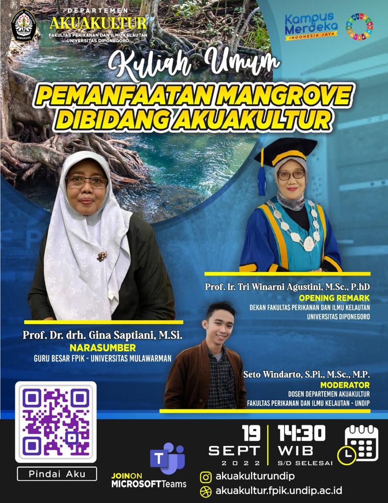 Aquaculture, Semarang – The Department of Aquaculture is proudly present public lecture entitled “Utilization of Mangroves in Aquaculture” which will be held on: